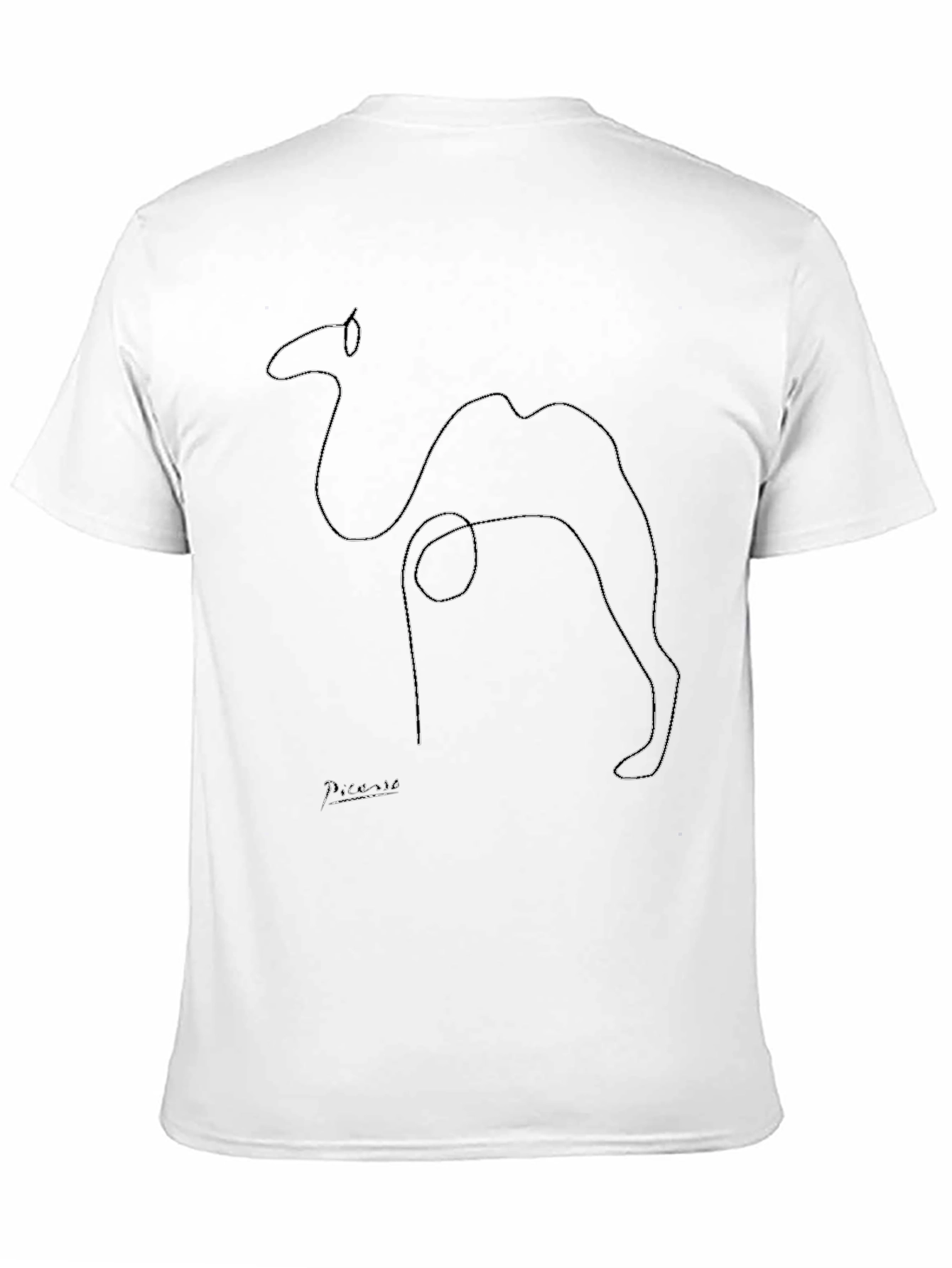 Showcase your artistic side with this black graphic tee. Featuring a minimalist camel line art design, reminiscent of Picasso's style, this shirt adds a touch of sophistication to your casual wear. The simple yet striking design is sure to turn heads and spark conversations. Crafted from comfortable, breathable fabric, this t-shirt is perfect for everyday wear. Ideal for art enthusiasts, animal lovers, or anyone looking to elevate their wardrobe with a unique piece. Pair it with jeans for a casual look or dress it up with a blazer for a night out.
