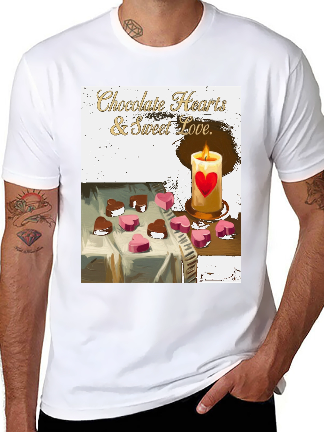 Indulge in the sweetness of love with this charming graphic tee. Featuring an artistic design of chocolate hearts, a glowing candle with a heart on it, and the text "Chocolate Hearts & Sweet Love," this shirt radiates romance. The print evokes the warmth of Valentine's Day or any special occasion celebrating affection. Made from comfortable materials, this tee is perfect for casual wear, date nights, or as a thoughtful gift for someone you cherish. Express your love with style and spread the sweet sentiment wherever you go. A wearable piece of art that captures the essence of love's delicious moments.