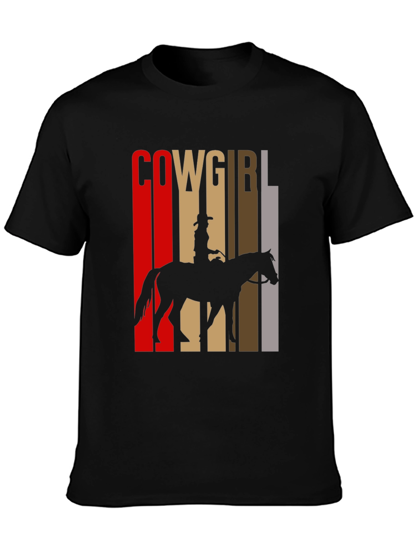 Show off your love for the Wild West with this unique graphic tee! This eye-catching black t-shirt features a striking silhouette of a cowgirl on horseback, set against vertical stripes of red, tan, brown and gray. The design incorporates "COWGIRL" in bold lettering, integrated into the striped background, creating a cool, vintage-inspired look. Made from a soft, breathable fabric, this tee is comfortable enough for everyday wear. Whether you're hitting the rodeo, hanging out with friends, or just want to express your individual style, this cowgirl t-shirt is the perfect choice. Pair it with your favorite jeans and boots for a complete Western-chic ensemble!