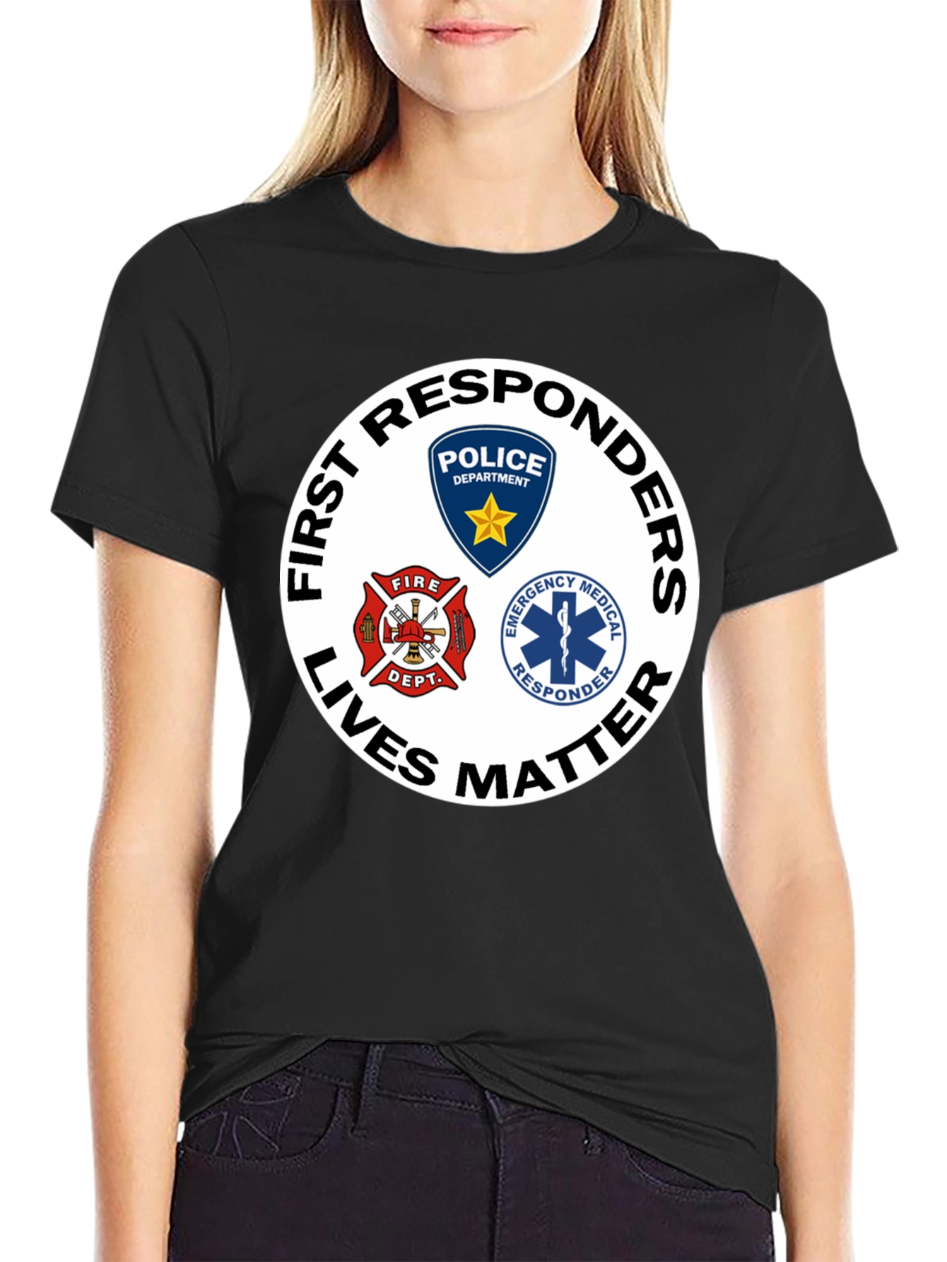 Show your support with this bold black graphic tee. Featuring a circular design that reads "First Responders Lives Matter," this shirt prominently displays the logos of Police, Fire Department, and Emergency Medical Responders. Made from a comfortable, soft fabric, this t-shirt is perfect for everyday wear. A great way to honor and appreciate our courageous first responders. Ideal for rallies, community events, or simply showing your support.