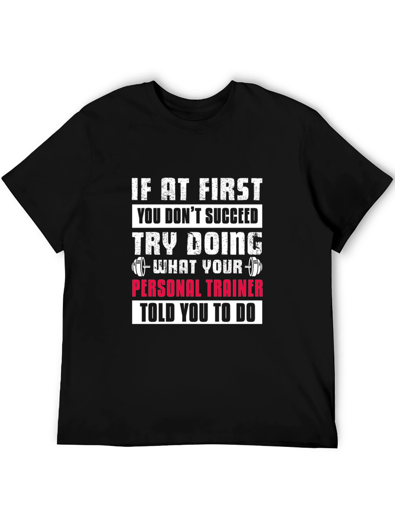 Show off your dedication to fitness with this bold black t-shirt! Featuring a humorous and motivational message, the shirt reads "IF AT FIRST YOU DON'T SUCCEED TRY DOING WHAT YOUR PERSONAL TRAINER TOLD YOU TO DO," making it a perfect conversation starter at the gym. The print is in a crisp white and red, and the tee looks to be a comfortable cotton blend, ideal for workouts or casual wear. If you're looking for something to wear that showcases your dedication to fitness, this will make a great addition to your wardrobe!