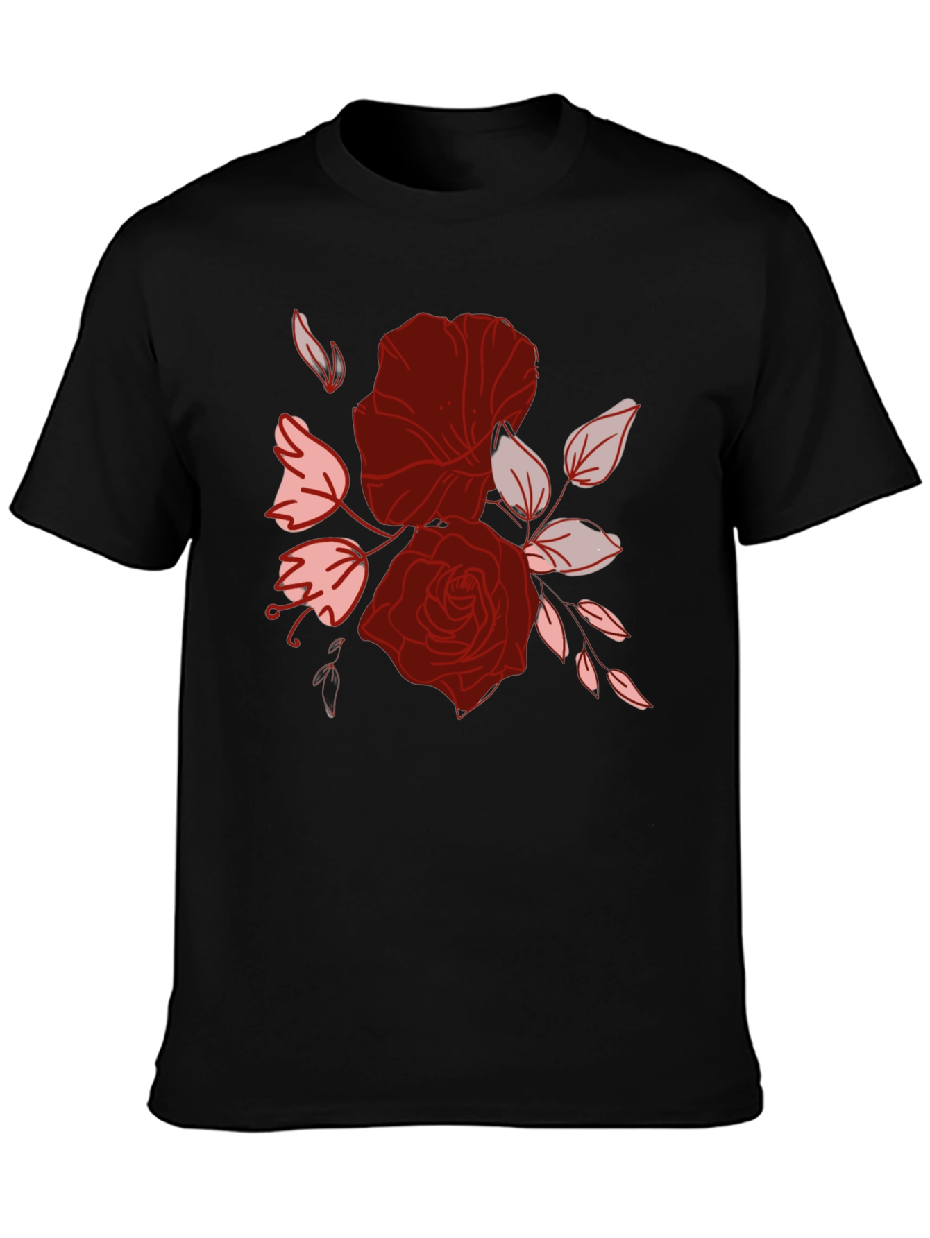 Elevate your casual wardrobe with this stylish black tee. Featuring a striking floral graphic print, this shirt adds a touch of elegance to your everyday look. The design showcases a beautiful arrangement of roses and leaves in shades of red and pink, creating a visually appealing contrast against the dark background. Made from comfortable, breathable fabric, it's perfect for all-day wear. Whether you're heading out for a casual outing or simply relaxing at home, this tee offers both style and comfort. Pair it with jeans or shorts for a versatile and fashionable ensemble.