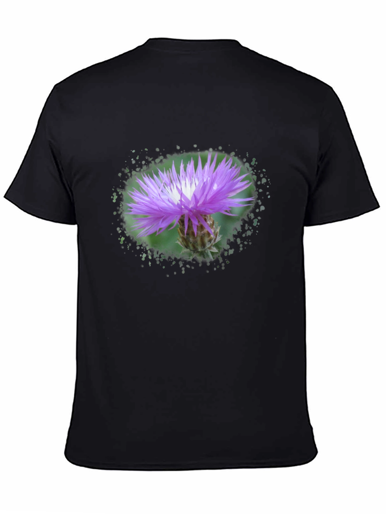 Showcase your unique style with this eye-catching black T-shirt featuring a vibrant purple thistle graphic. The detailed floral design is printed on a soft, comfortable fabric, making it ideal for everyday wear. The tee has a classic fit that complements any casual outfit, from jeans to shorts. Whether you're strolling through the park, meeting friends for coffee, or simply relaxing at home, this T-shirt is sure to make a statement. Add a touch of nature-inspired artistry to your wardrobe with this must-have graphic tee. A great gift idea for nature lovers!