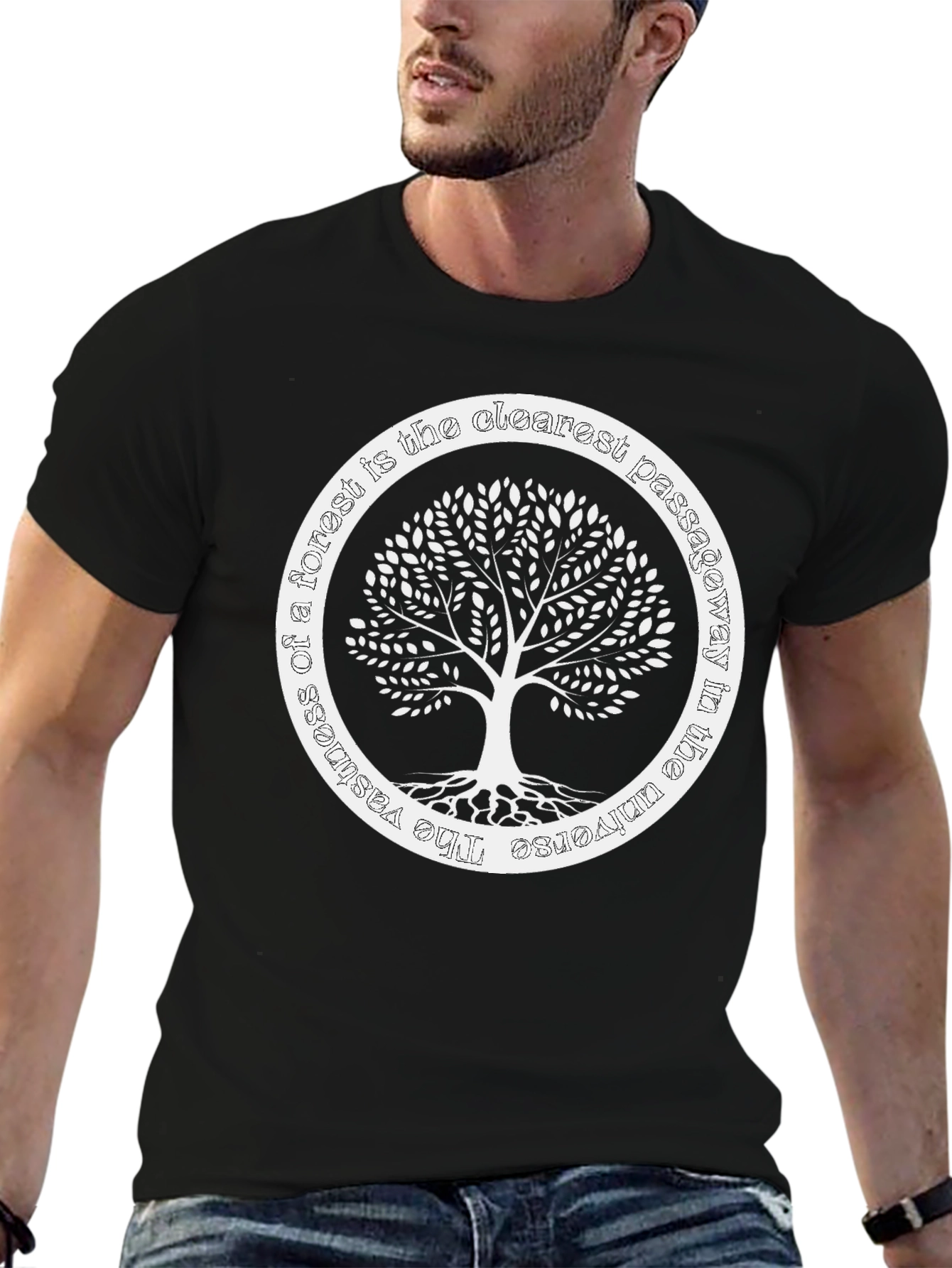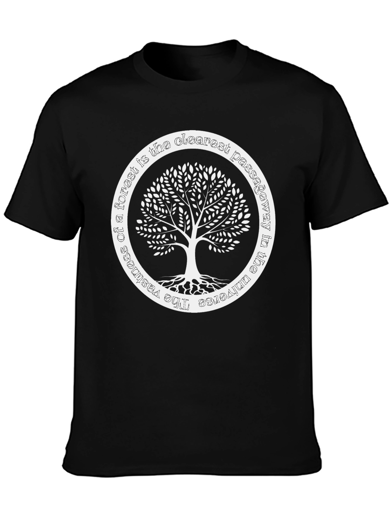 This striking black t-shirt features a captivating white graphic of a tree encircled by the words "Of a forest is the clearest passageway in the universe." The design is simple yet elegant, making it a versatile addition to any wardrobe. Made from soft, breathable fabric, this t-shirt offers both style and comfort. Perfect for casual outings, nature enthusiasts, or anyone seeking a unique statement piece. Stand out with this eye-catching tee that combines artistry and comfort effortlessly. It's more than just a t-shirt; it's a conversation starter.