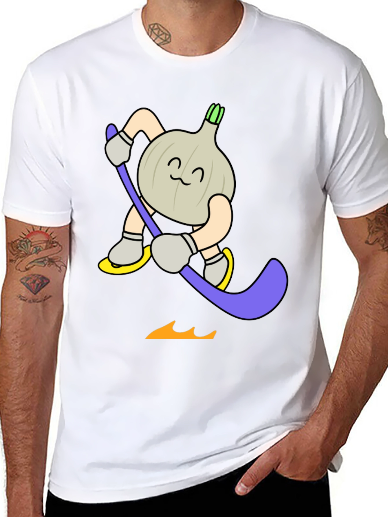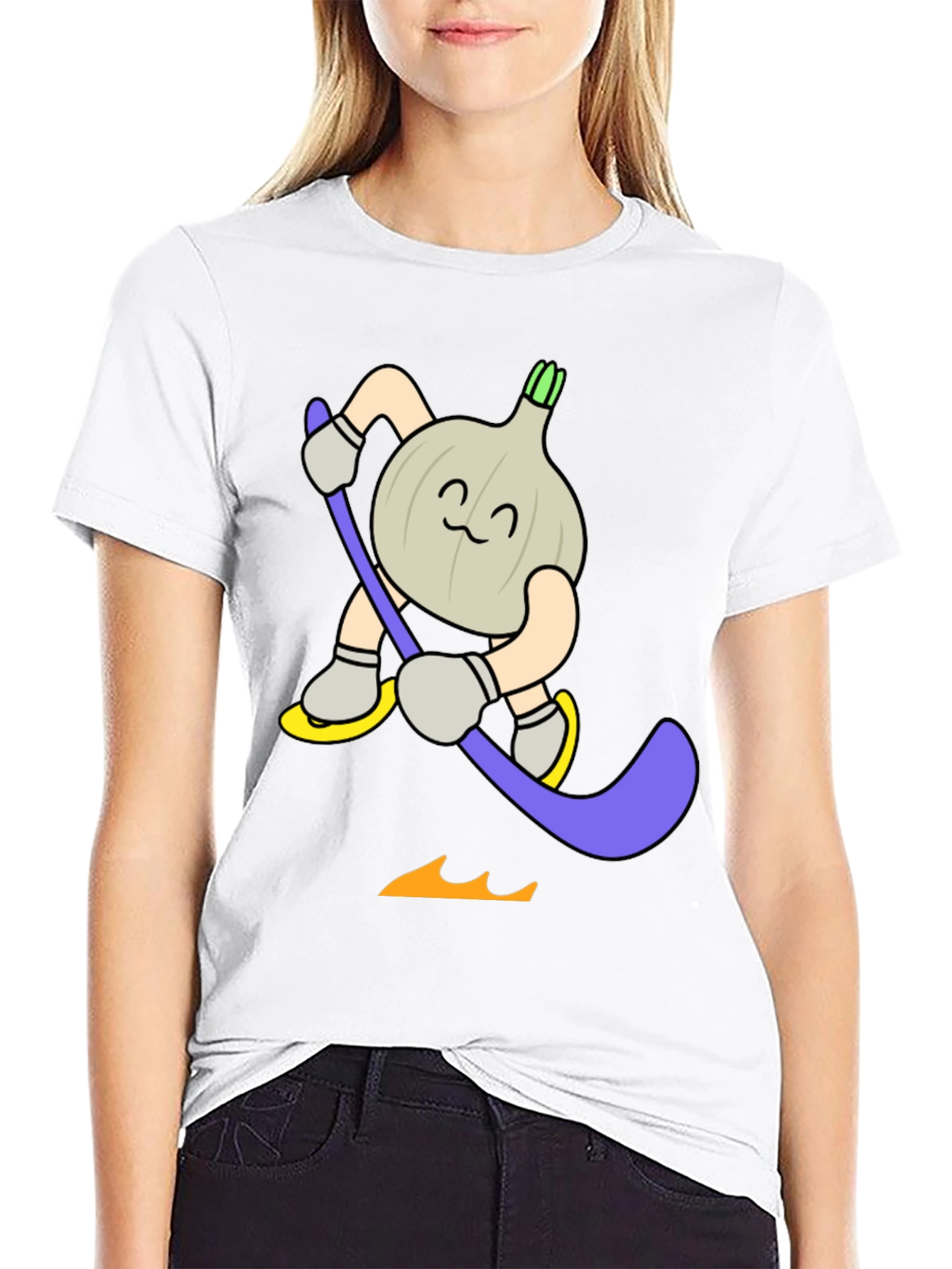 This fun black t-shirt features a cartoon drawing of a garlic bulb playing hockey. The garlic character has a cute, happy face, arms, and legs. It's wearing gloves and skates, holding a hockey stick. Below the garlic, there is an orange wave. The design is eye-catching and playful. The shirt appears to be made of a comfortable, breathable material, perfect for casual wear. Show off your unique style with this whimsical tee, ideal for anyone who loves quirky designs and enjoys a good laugh. Perfect for everyday wear!