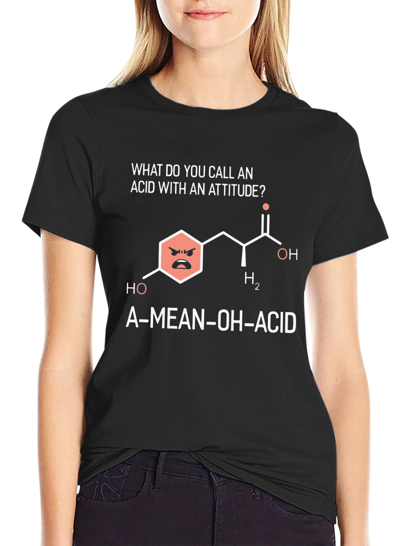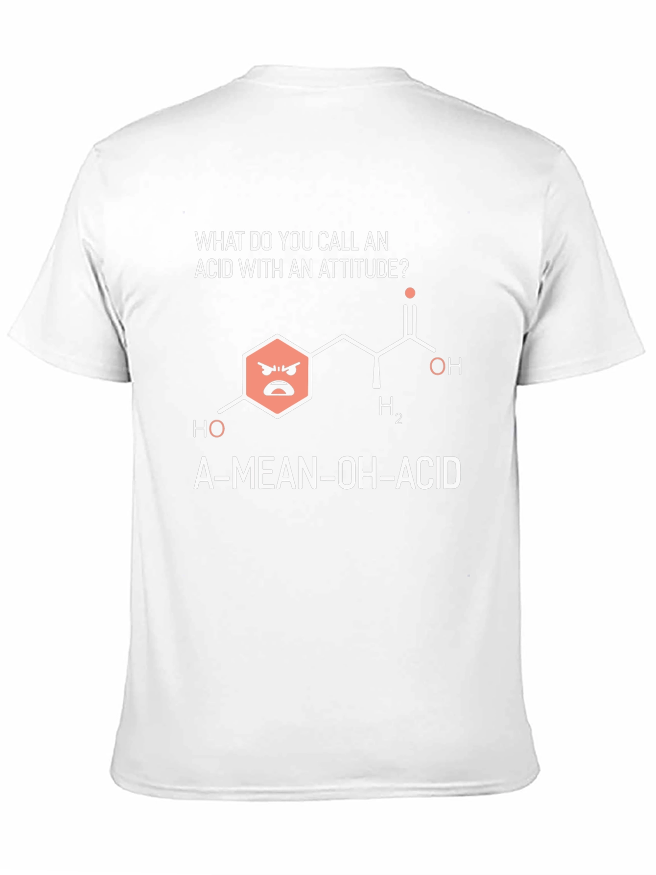 Show off your nerdy side with this witty graphic t-shirt! This black tee features a humorous chemistry joke, "What do you call an acid with an attitude? A-MEAN-OH-ACID", accompanied by a clever chemical structure graphic. The design is printed in bright white and orange, ensuring it stands out. Made from a comfortable, breathable fabric, this shirt is perfect for casual wear, science enthusiasts, chemistry students, or anyone who loves a good pun. Makes a great gift!