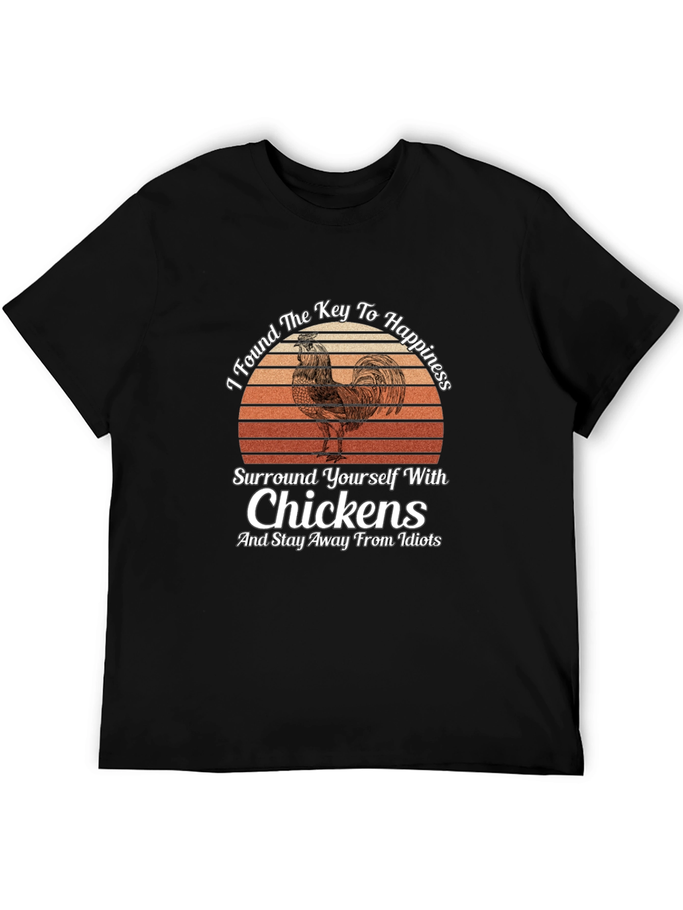 Show off your love for chickens with this unique black t-shirt. The shirt features a graphic design with a rooster silhouette set against a striped sunset background. Bold white text reads, "I Found The Key To Happiness Surround Yourself With Chickens And Stay Away From Idiots." Made from a comfortable-looking fabric, this short-sleeved tee is perfect for casual wear. It's an ideal gift for chicken owners, farmers, or anyone who appreciates a good laugh. Wear it to the farm, a poultry show, or simply around town to share your passion.