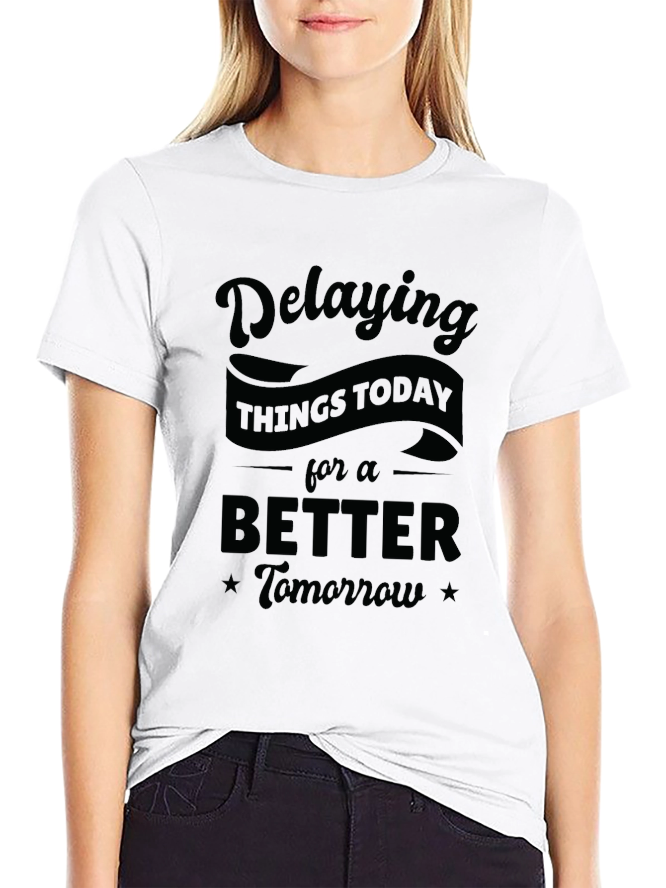 This classic black t-shirt features a witty graphic design that's sure to spark conversation. The design includes the phrase "Delaying Things Today for a Better Tomorrow." The shirt appears to be made from a soft and comfortable material. It's perfect for casual wear, lounging around, or making a statement with a touch of humor. This tee is ideal for anyone who appreciates a laid-back style with a playful twist. The bold print ensures that the message stands out, making it a great addition to any wardrobe. Wear it to social gatherings, casual outings, or simply as a daily reminder to embrace life's little ironies.