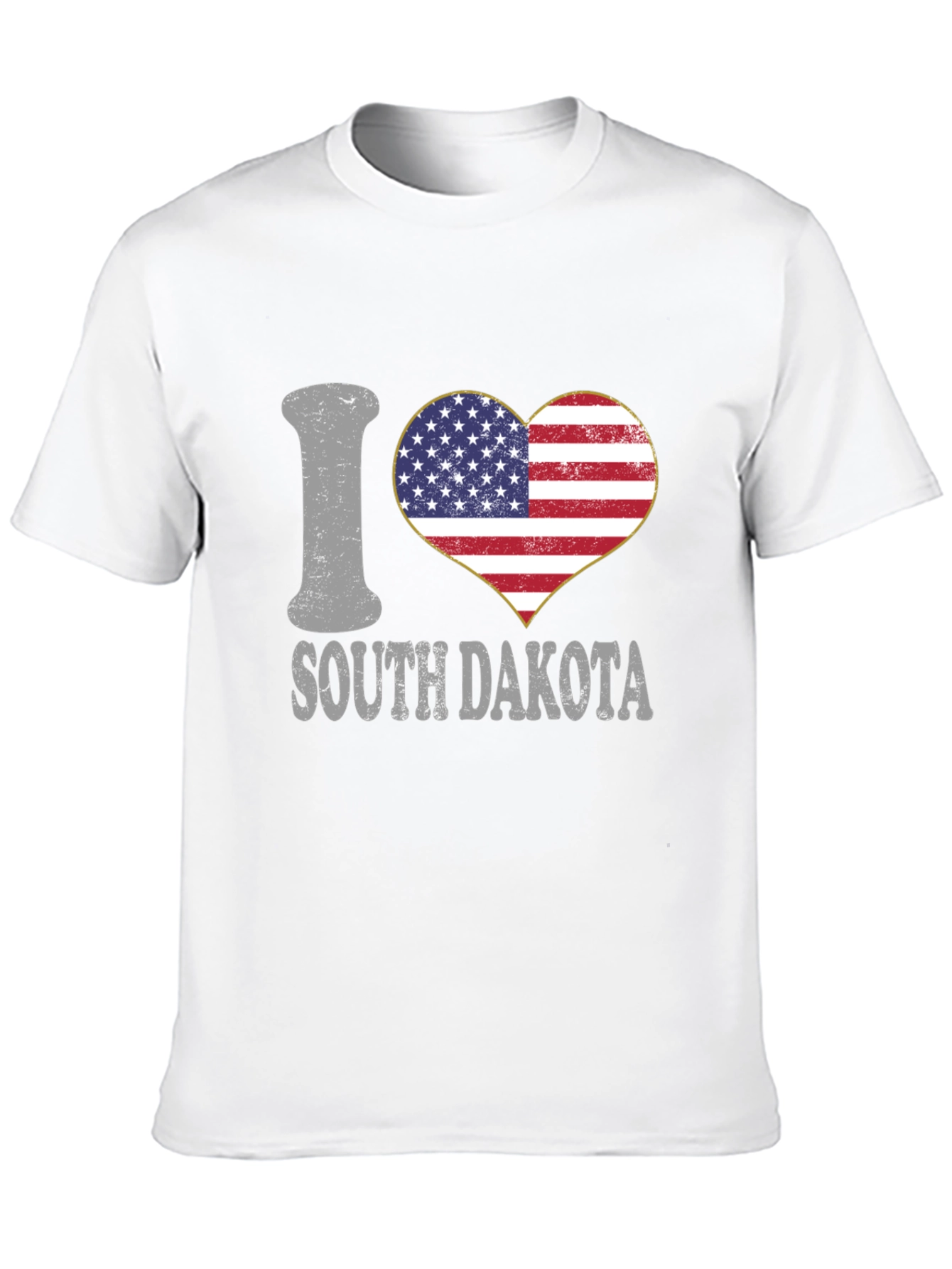 Show your love for South Dakota with this stylish and patriotic t-shirt. The shirt features a bold "I" and a heart filled with the American flag design, followed by "South Dakota" in a distressed font. This unique design makes a statement while showcasing your pride for the state. Made from comfortable, breathable fabric, this t-shirt is perfect for casual wear, state-themed events, or as a gift for South Dakota enthusiasts. Wear it to show your South Dakota pride!