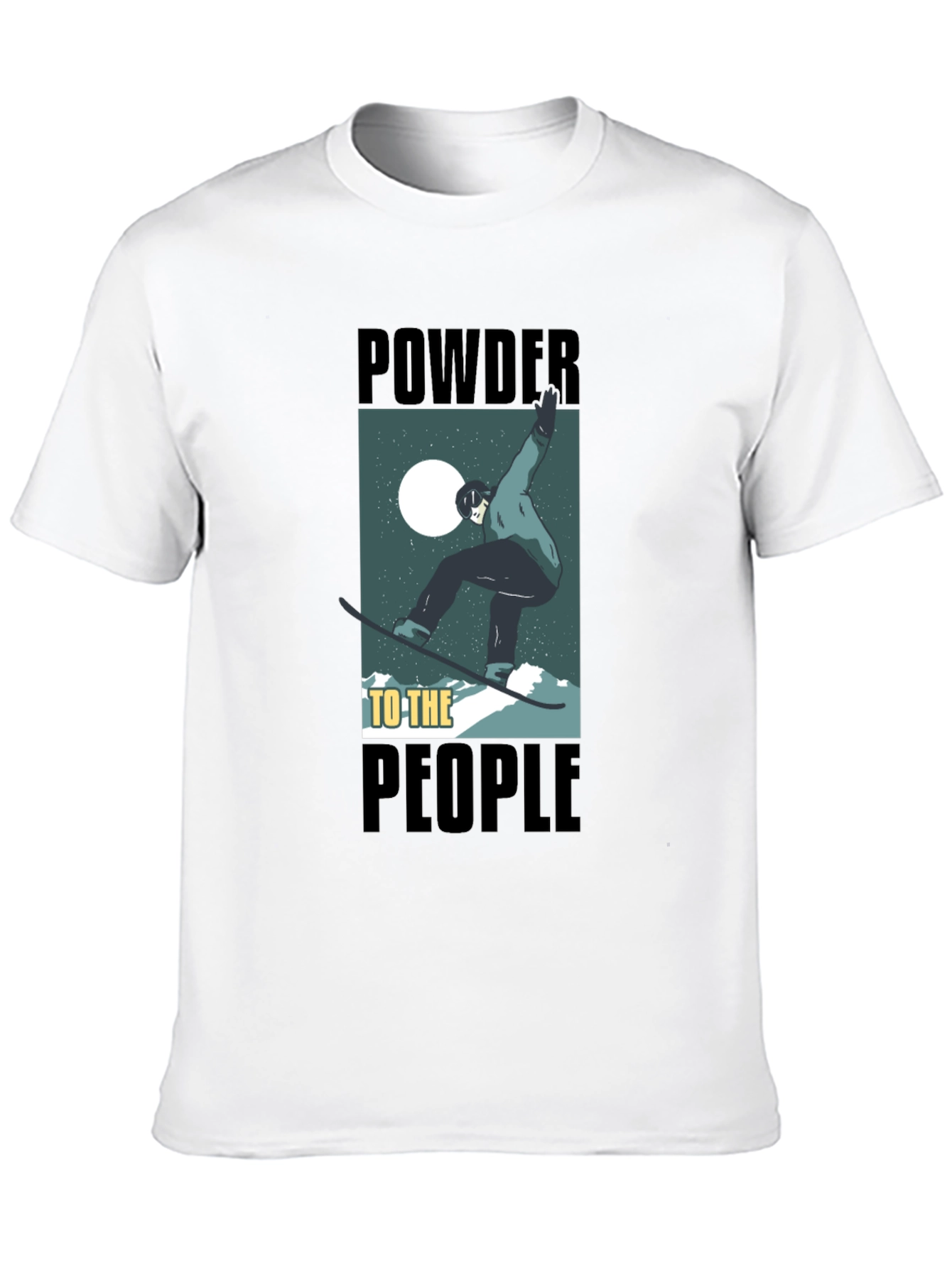 This black t-shirt features a unique and eye-catching graphic design. The design shows a snowboarder set against a stylized mountain landscape with the words 'POWDER TO THE PEOPLE' printed. The shirt looks to be made from a soft and comfortable fabric, perfect for everyday wear. Ideal for snowboard enthusiasts and winter sports lovers. This tee allows you to express your passion for the slopes even when you're not on the mountain. It's suitable for casual outings, snowboarding trips, or as a gift for the snowboarder in your life. This t-shirt is sure to become a favorite in your wardrobe.
