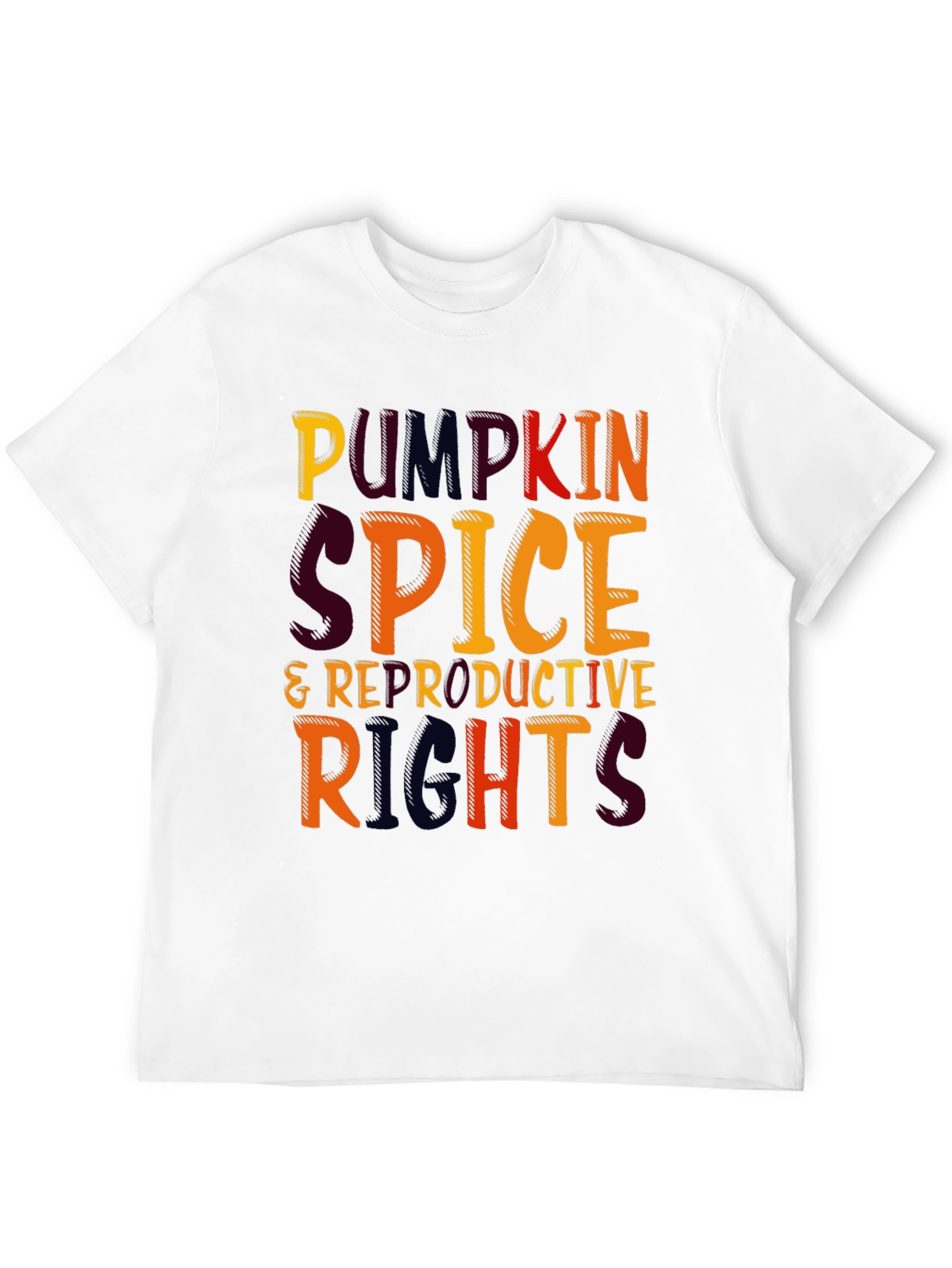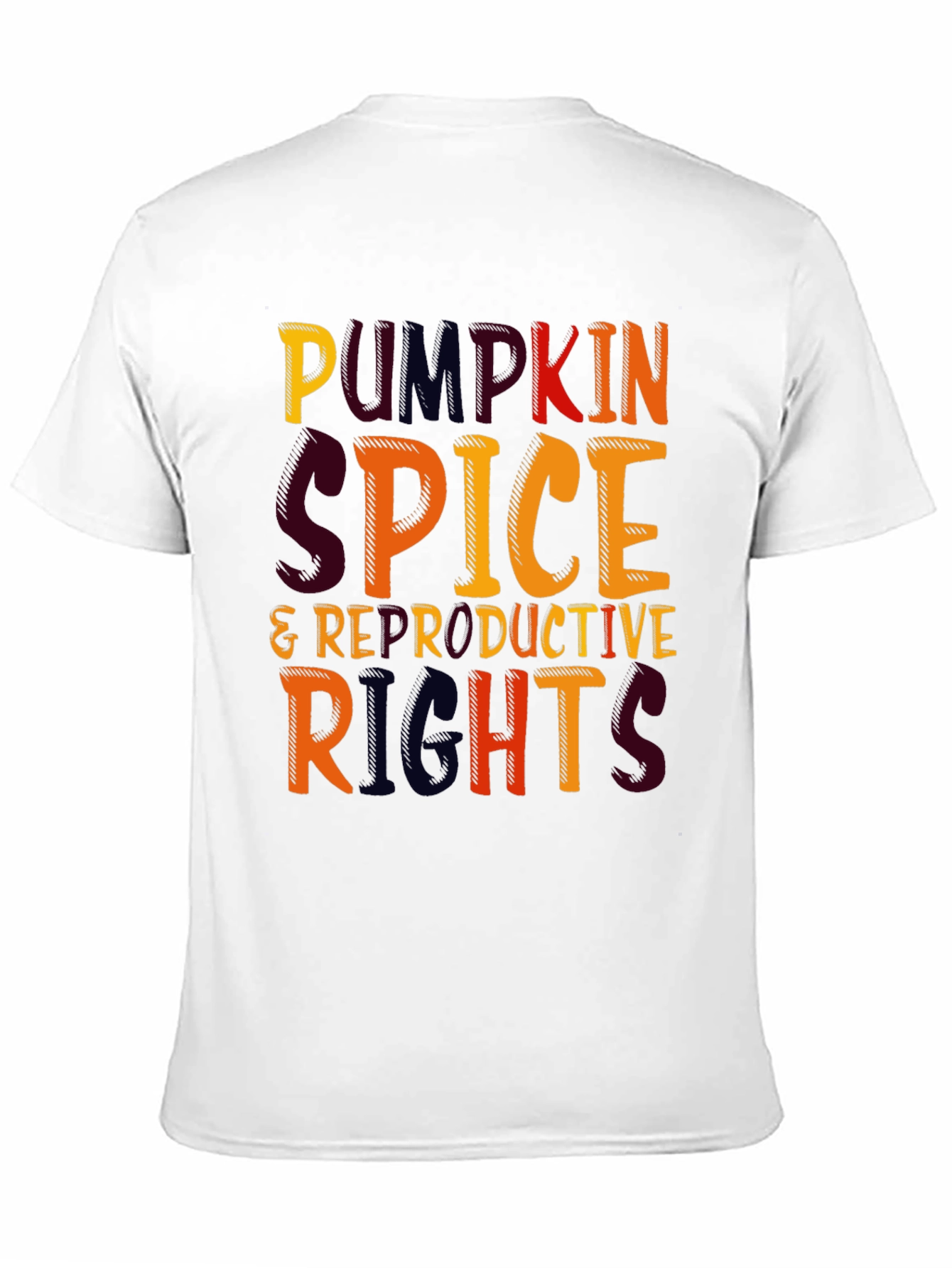 Express your support for reproductive rights this fall with this unique t-shirt! The design features a bold, colorful graphic that reads "Pumpkin Spice & Reproductive Rights" in a playful, autumnal font. The lettering combines shades of orange, yellow, and brown, evoking the cozy vibes of the season. Made from a comfortable fabric, this tee is perfect for everyday wear, rallies, or casual activism. Spread awareness and look stylish while advocating for important issues.