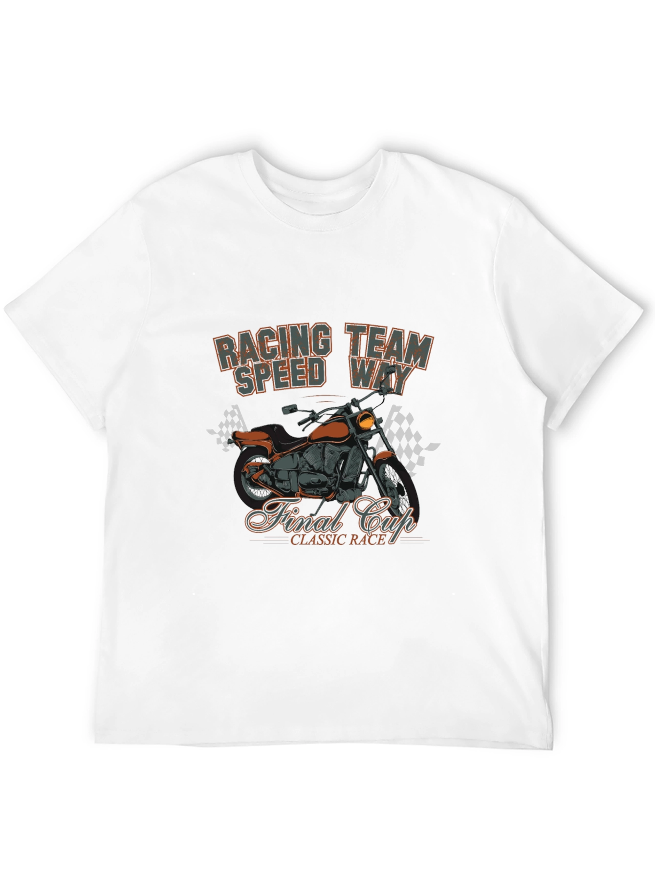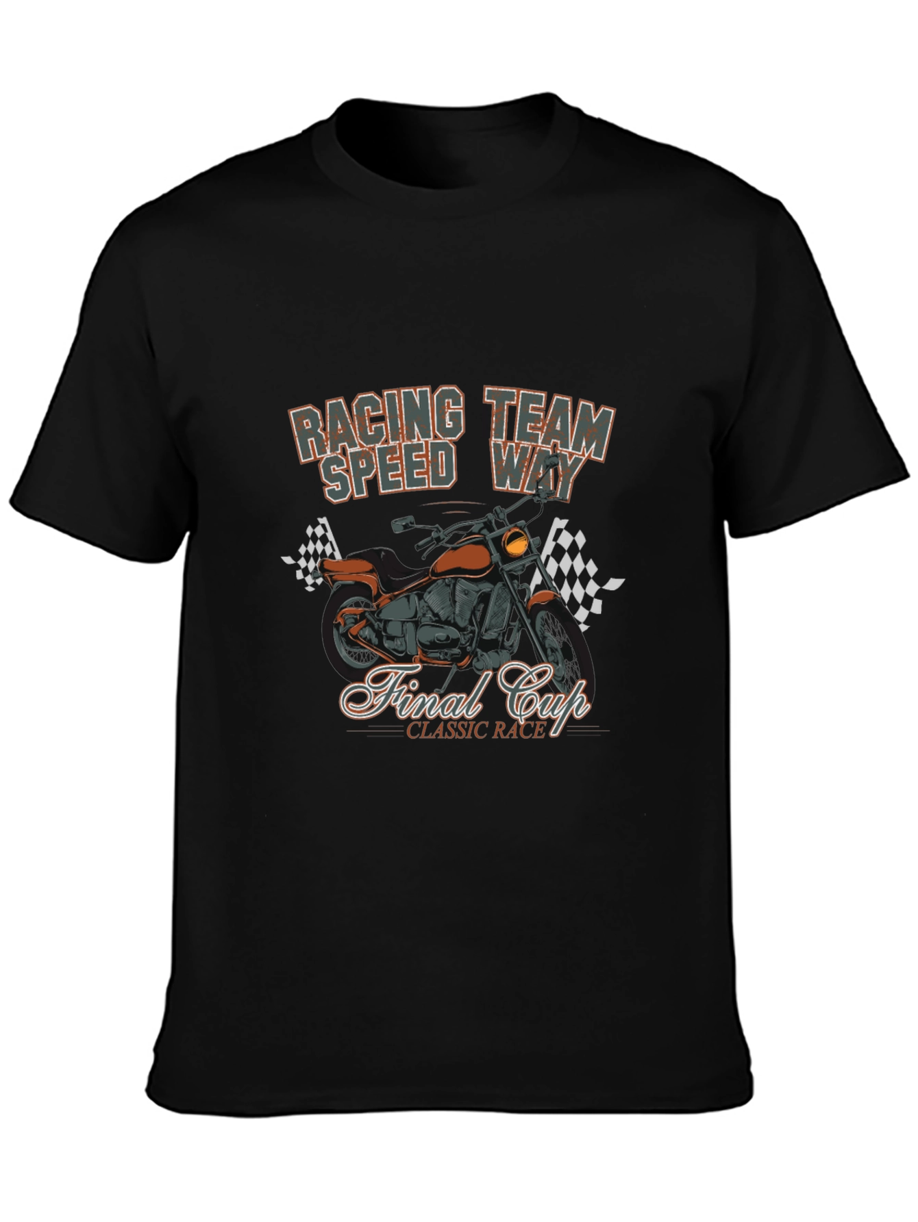 Rev up your style with this bold black graphic tee! Featuring a vibrant "Racing Team Speedway" motorcycle design, complete with checkered flags and the declaration "Final Cup Classic Race", this shirt embodies vintage racing flair. The design is printed on what appears to be a soft, comfortable cotton blend, perfect for everyday wear or showing off your passion at motorsport events. The classic crew neck and short sleeves offer a relaxed fit. Whether you're a racing enthusiast or simply love standout graphics, this tee is a must-have addition to your wardrobe.