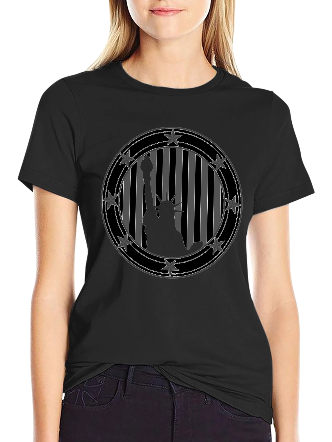 Show your American pride with this striking Statue of Liberty graphic tee. The bold black shirt features a unique design of the iconic monument silhouetted against a striped background, encircled by stars. This eye-catching, round design is sure to turn heads and spark conversation. Made from a comfortable and durable fabric, this t-shirt is perfect for casual wear, patriotic holidays, or expressing your love for the USA. Pair it with jeans or shorts for a stylish and effortless look. Available in various sizes. This tee is a must-have for anyone who wants to showcase their American spirit in a modern and fashionable way.