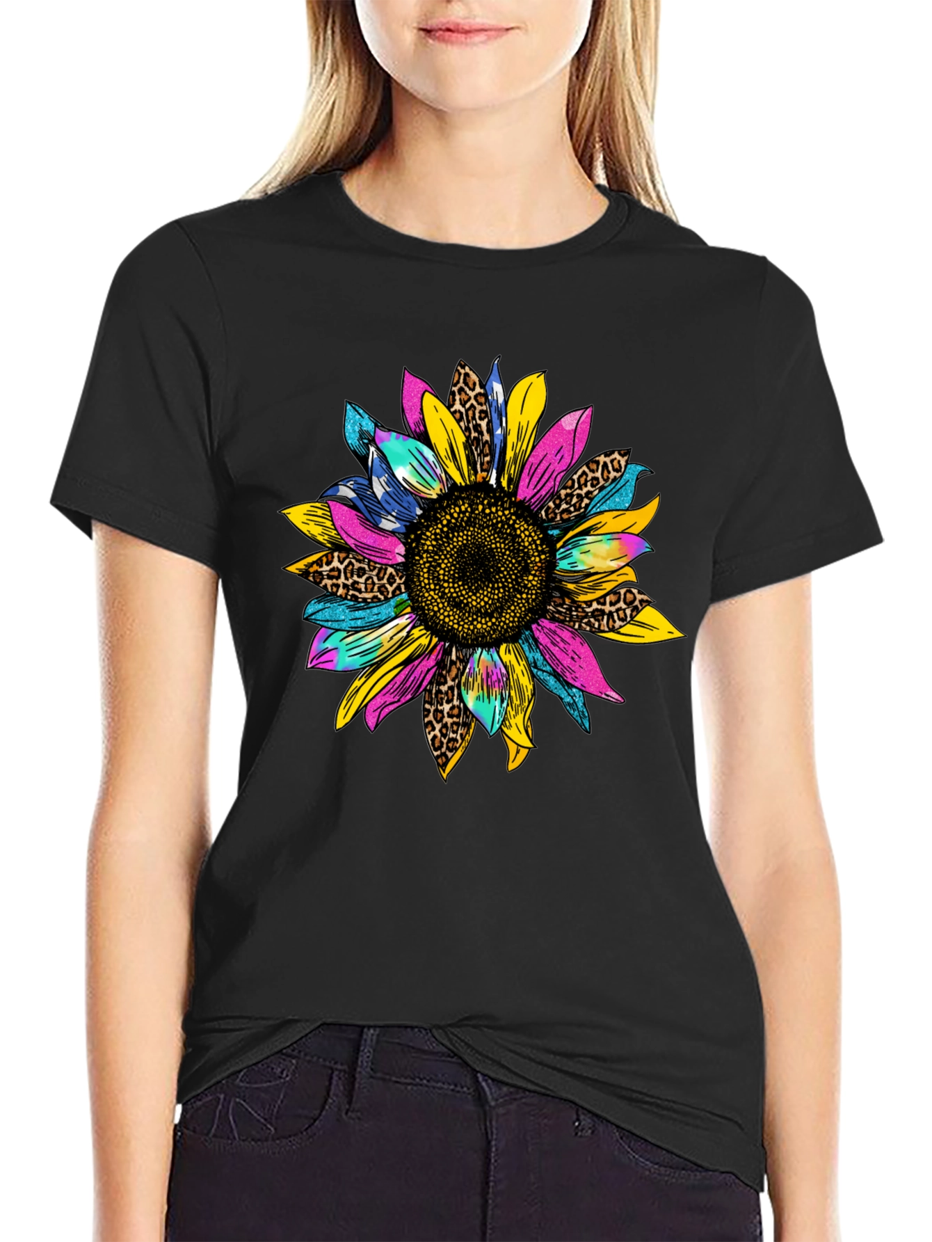 Add a splash of color to your wardrobe with this eye-catching black T-shirt. Featuring a vibrant and unique sunflower graphic, this tee is perfect for casual everyday wear. The sunflower design incorporates a mix of bright colors and leopard print patterns, making it a standout piece. Made from a comfortable and breathable fabric, this T-shirt is ideal for warm weather or layering under a jacket. Its relaxed fit ensures all-day comfort. Pair it with jeans, shorts, or a skirt for a stylish and effortless look. Perfect for adding a pop of personality to any outfit.
